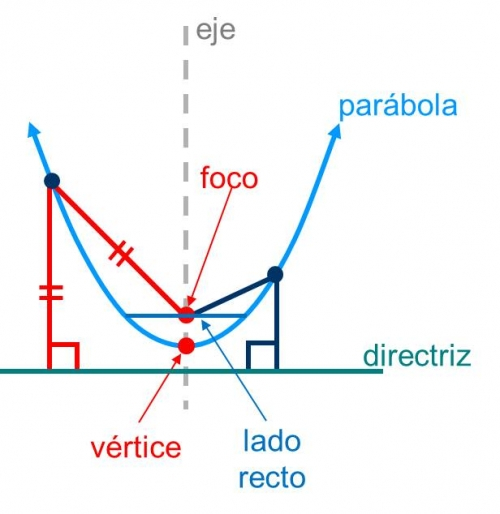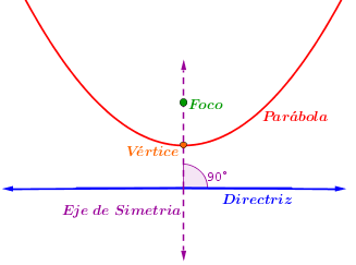 De la construcción anterior se puede probar que la parábola es simétrica respecto a la recta perpendicular a la directriz que pasa por el foco. Al punto de intersección de la parábola con tal recta (conocida como eje de la parábola) se le llama vértice de la parábola y es el punto cuya distancia a la directriz es mínima. La distancia entre el vértice y el foco se conoce como distancia focal o radio focal